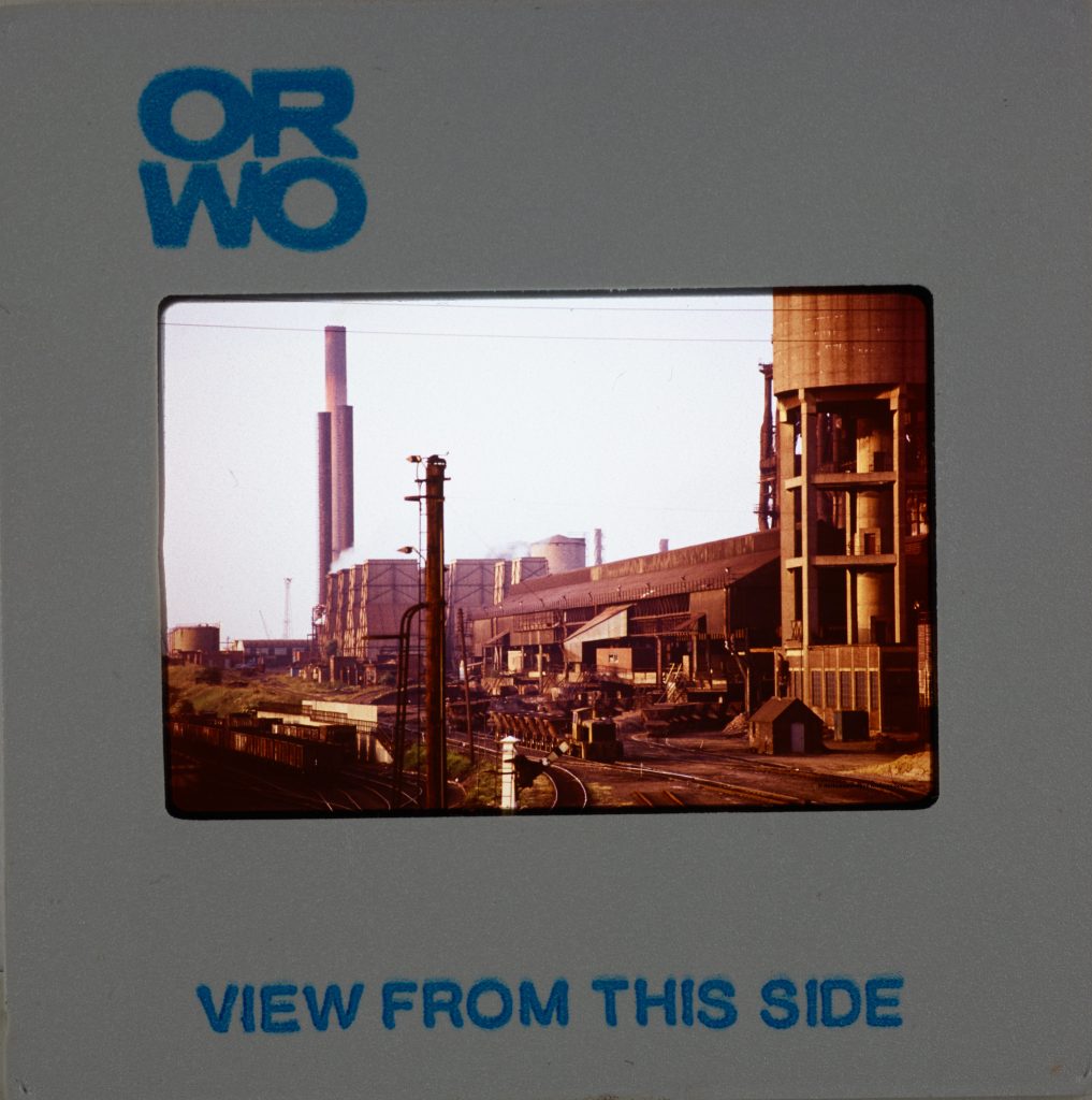 This is a shot of the Blast Furnace frontside area (the side of the furnaces where the iron and slag are poured in to ladles (iron) and pots (slag). The loco is hauling slag pots that appear to contain molten slag, evidenced by the haze above the line behind the loco itself. Lloyds sidings are to the left of the picture and the tall chimney in the background is that of No 6 Sinter Plant, with the smaller stacks that appear to be attached to the side of the concrete chimney are those of the Central Power Station.