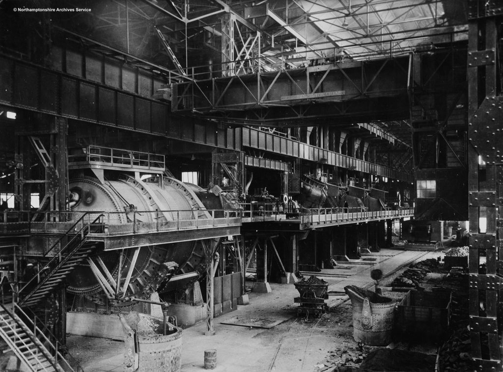 The view is of the 1000 ton mixer in the left foreground, with the four Bessemer Convertors in the background and a charging ladle in the right foreground.