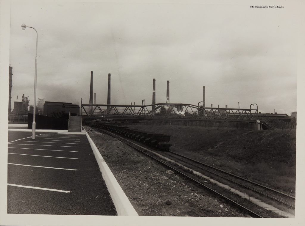 The empty wagons are being hauled back to The Works by a diesel loco, from the Tarmac Plant, passing the main Steelworks car park. The pedestrian bridge links the main Steelworks parking area to the main road into The Works, passing the main Steelworks Admin Block (out of frame) on the right of the photo. The five chimneys are for the Glebe Coke Oven batteries and the edge of the Blast Furnace Gasholder can be seen on the left of the picture. The black shed behind the steps to the bridge is the bike shed.