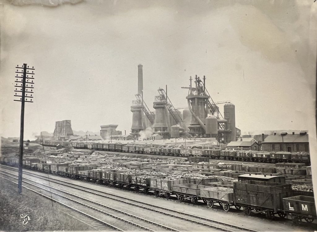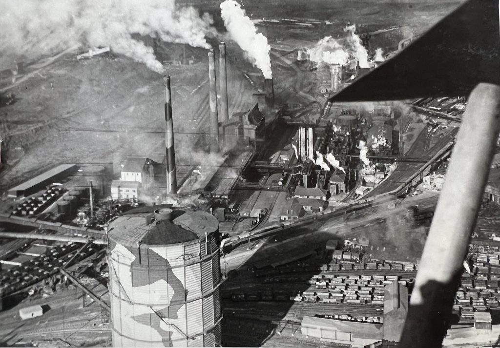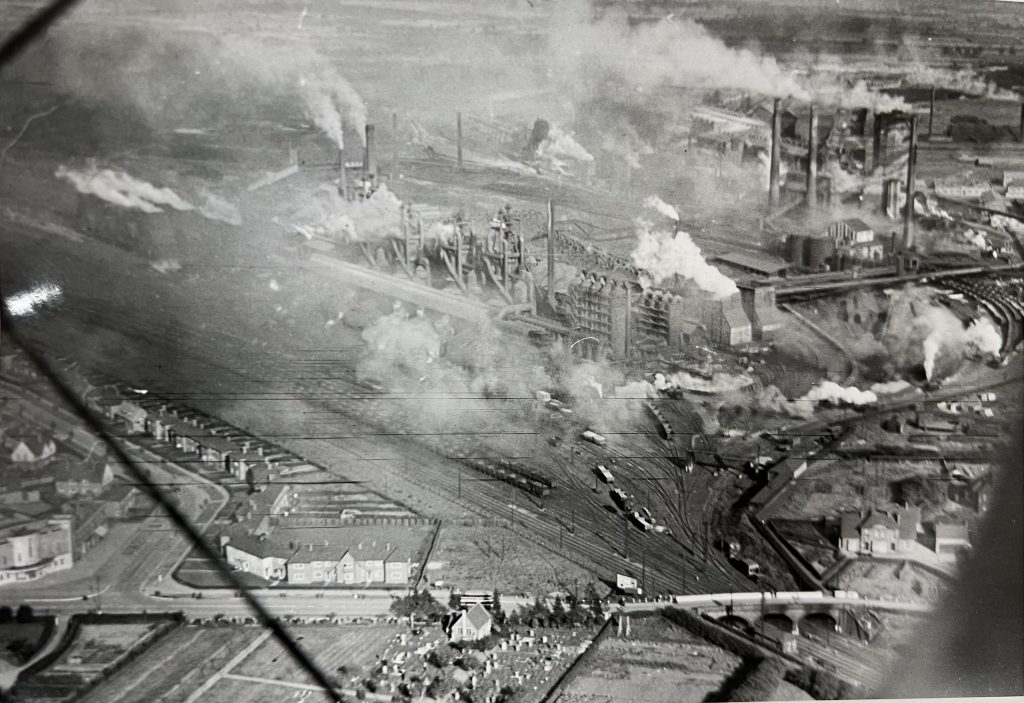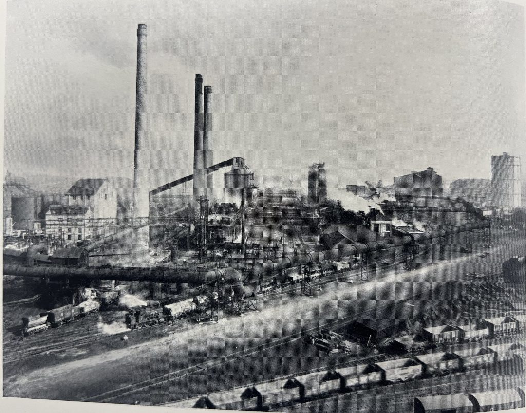 Taken from the BF Gas Holder, as evidenced by the line of wagons below and the alignment of the Coke Oven chimneys, with the Coke Oven Gas Holder by the main gate in the distance. Taken around 1939 at a guess, judging by the newness of the nearest chimney.