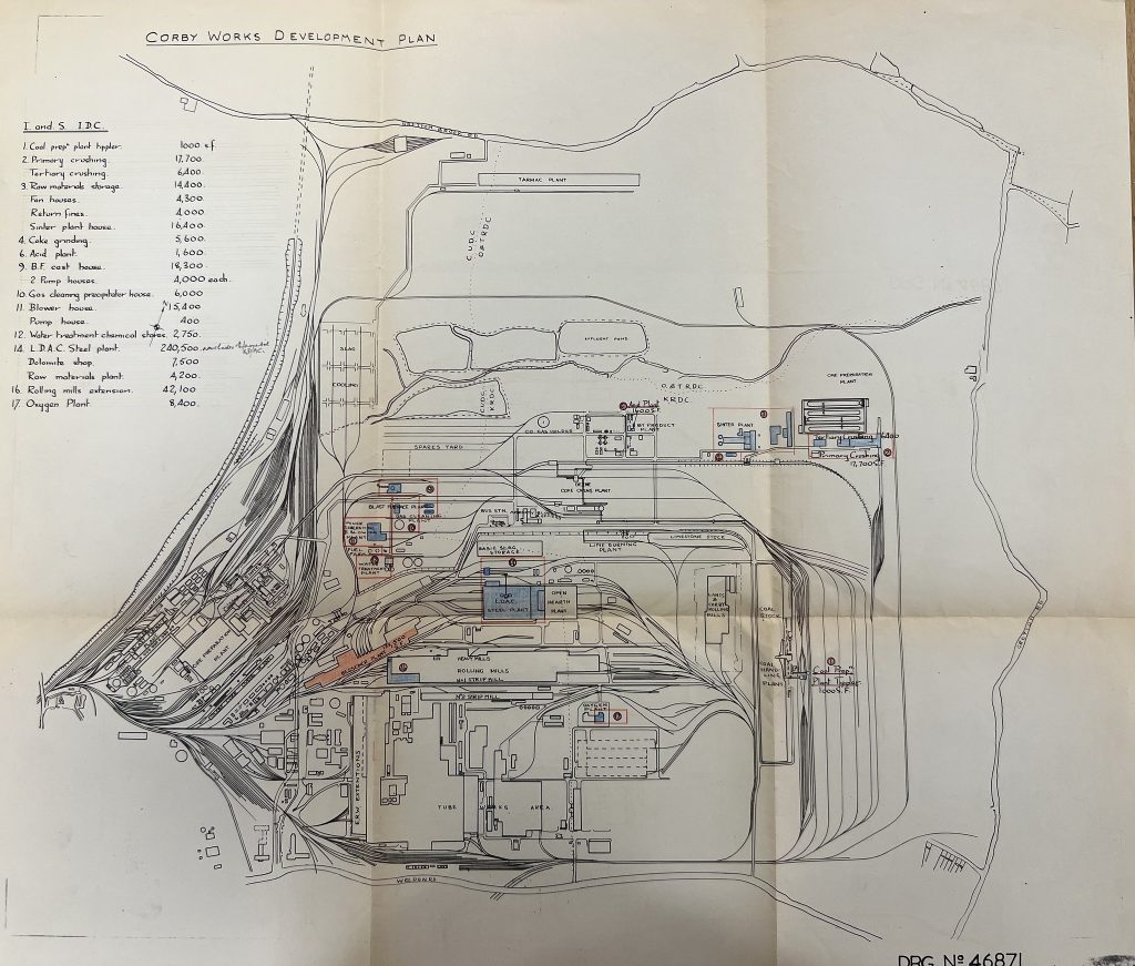 This Works plan , at a guess, was drawn in the early 1960s. It shows the BOSP as the LD/AC plant, which was the pilot plant to the final version and the Deene Coke Ovens are shown, they opened in 1961. The BOSP came on stream in 1965.
