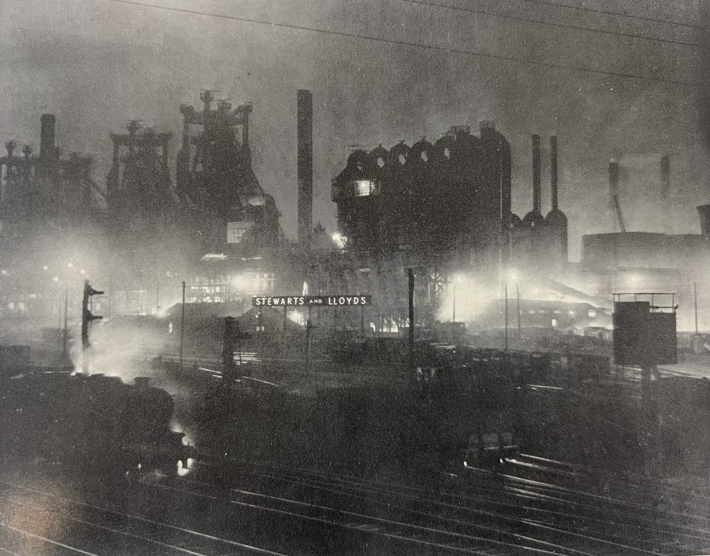 Taken in the late 1950s – there is a BR steam loco on the lhs and the “Stewarts and Lloyds” sign is illuminated, which definitely puts it in the 1950s at the earliest.