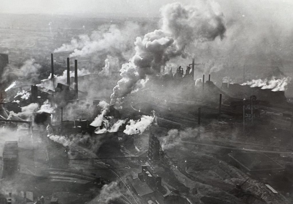 Glebe Coke Oven chimneys, with coke being quenched in the East Quench tower, taken around 1934. The view shows only two Blast Furnaces, with the third still to be built and was taken from above the Eastern end of the Bessemer building.