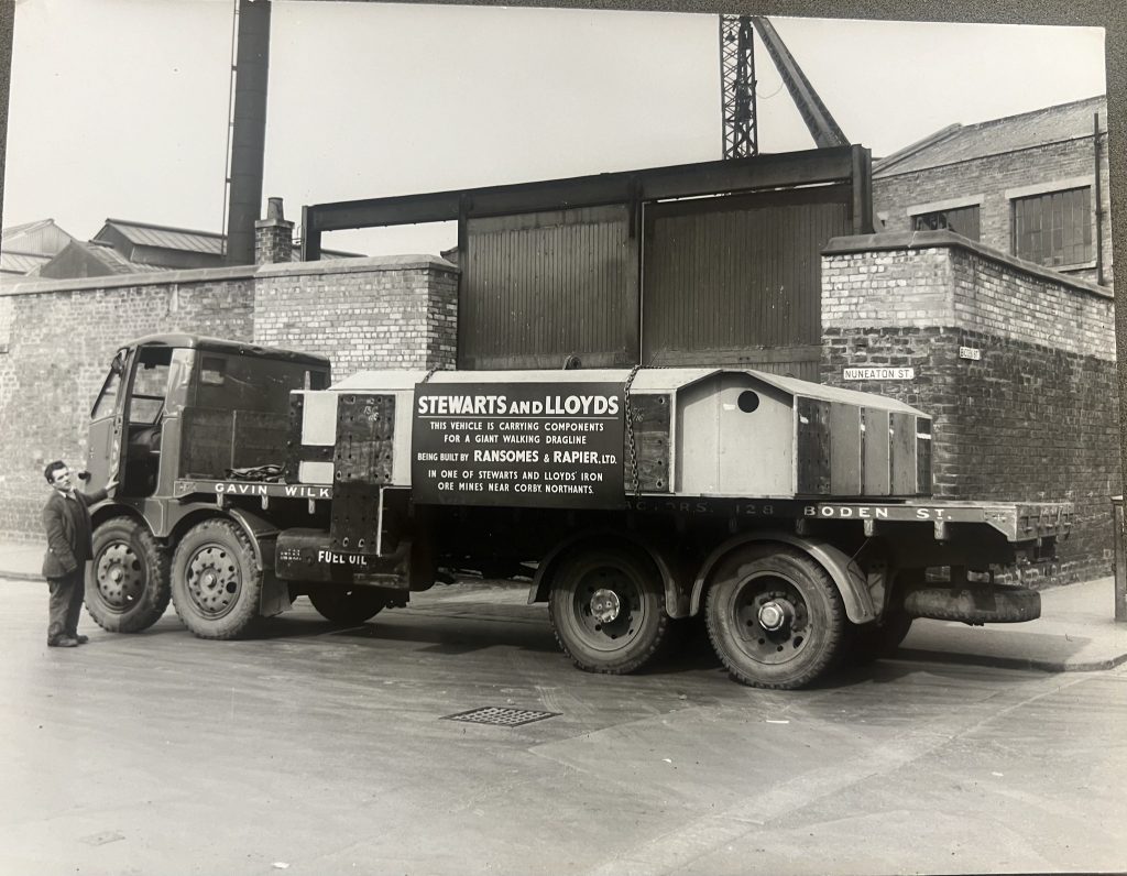 Components for the W.1400 walking dragline being assembled for Stewarts and Lloyds minerals, Limited at Cowthick near Corby,Northants. This view is of material on route from the works of Sir William Errol& co., Glasgow.