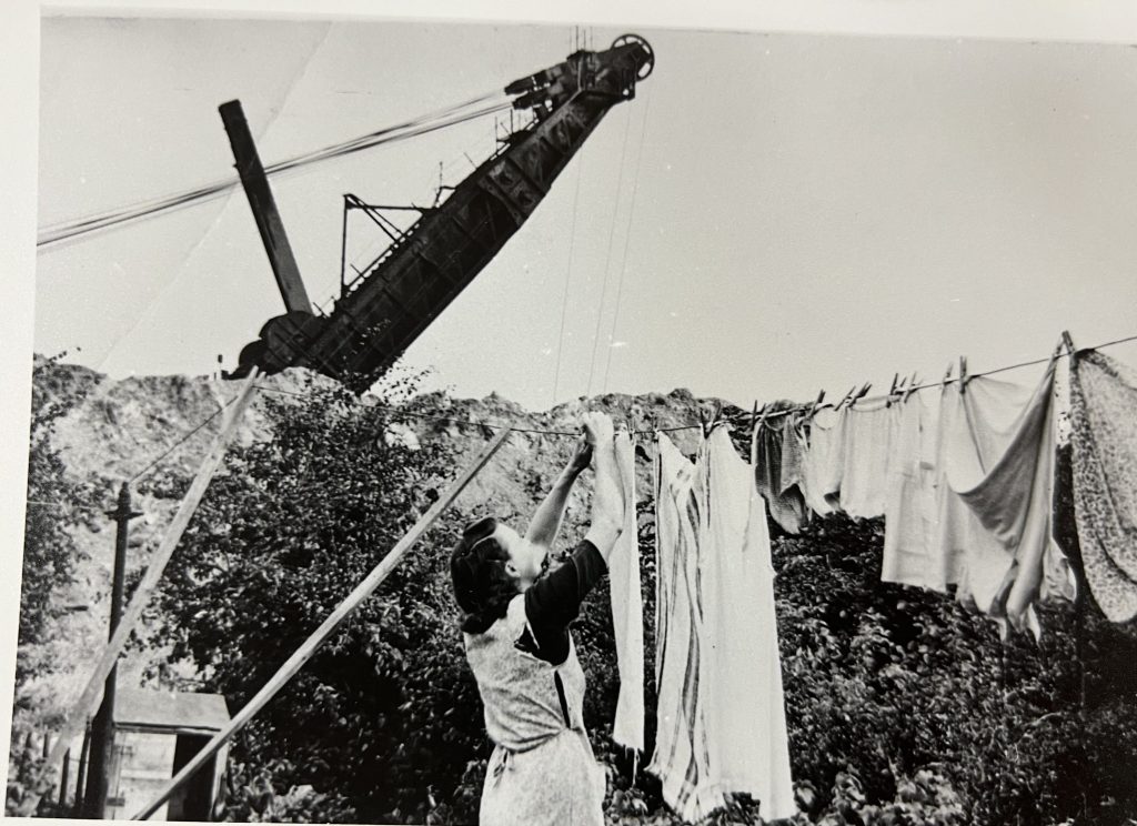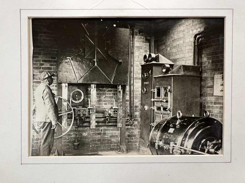 Bert Payne in the skip house ,where he controlled the skip hoist for loading the furnace, and the bell (working diagram above his head)for dropping the ore and limestone into the furnace.