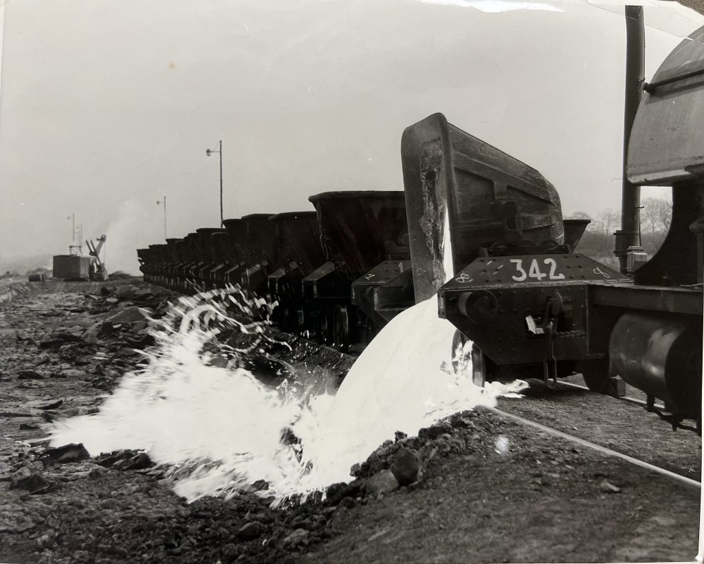 This photo showing the Tarmac wagons was taken shortly after the redevelopment of the Lloyds Ironstone blast furnaces began, i.e. around 1933. Tarmac set up there long before the rebuilding of the BF plant and, because of the layout of the new I&S plant, their workings here were to be the ore blending storage after the crushing plant. It was at that point that the Tarmac works were moved down to the Stanion Lane site.