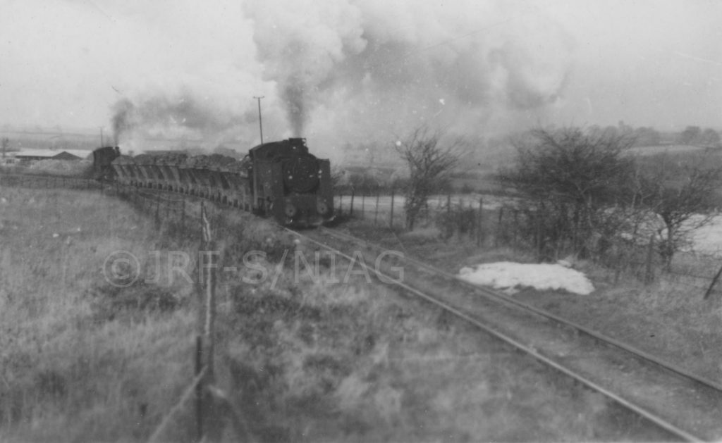 The final full year of operations at the South Durham Iron & Steel Co. Irchester Quarries, with one of the two 1952-built ex-Cargo Fleet Steelworks chunky Andrew Barclay 0-4-0 saddle tanks ‘9’ (W/Nos.2323) hauling a train of empty tippler wagons on 10th May 1968, its sister ‘7’ (W/No.2324) standing outside the loco shed, also in steam. Upon being taken over by the British Steel Corporation, the quarries were closed on 27th June 1969, and most of the track had been lifted by March 1970.