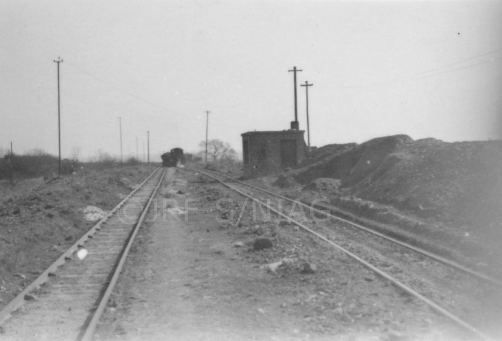 Cherry hall pit , The final days of working , majority of railway track has been removed ,the loading out of the final proceedings of ore can be seen in the distance . Taken on 2nd November 1953. Northampton archives.