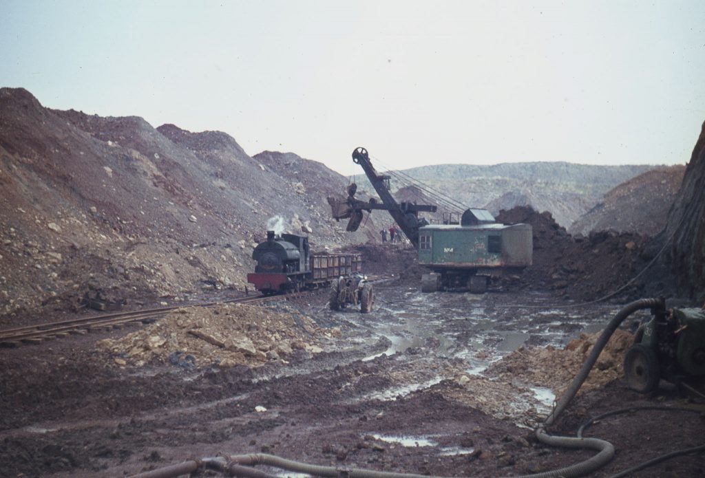 A Ruston-Bucyrus 55-RB electric face shovel loading ore at Wellingborough No 6 pit in 1966. The motive power is a metre gauge 0-6-0ST Peckett loco. NIAG image .