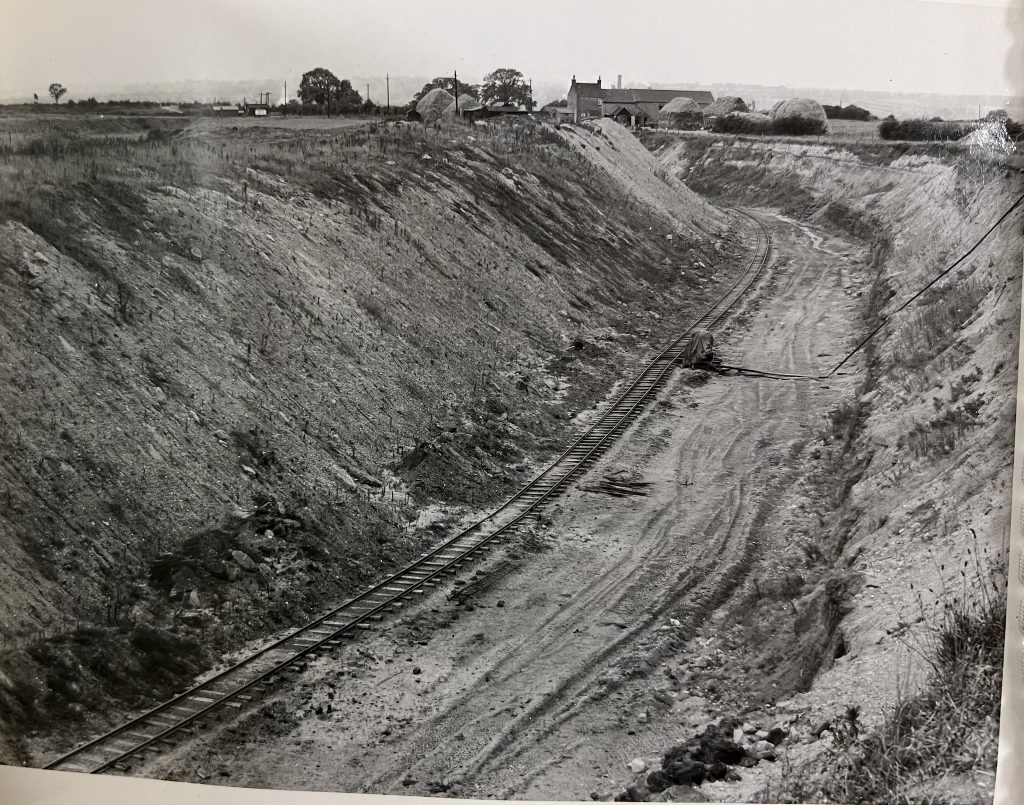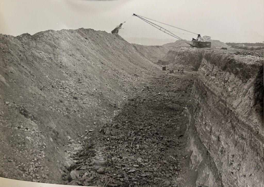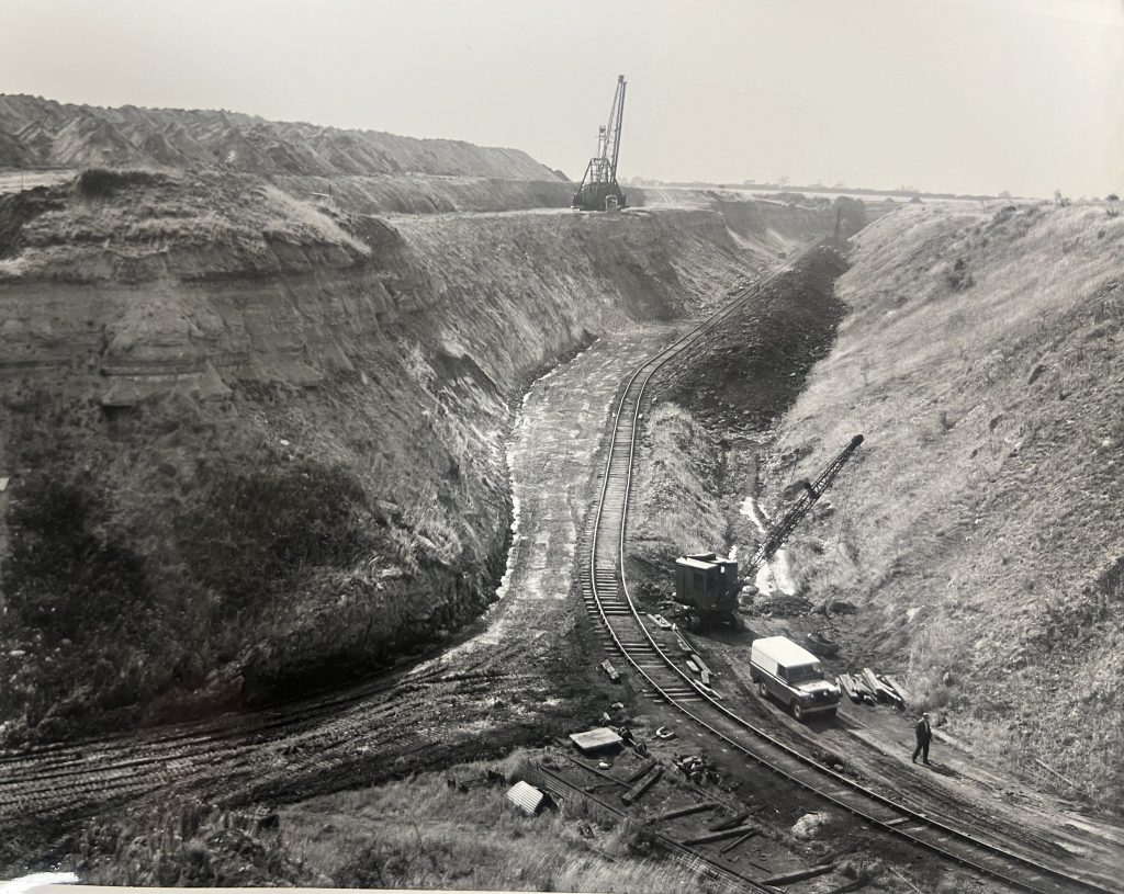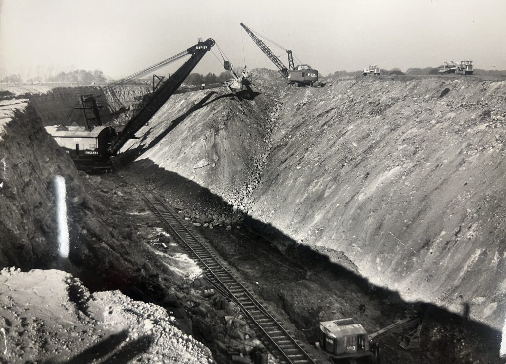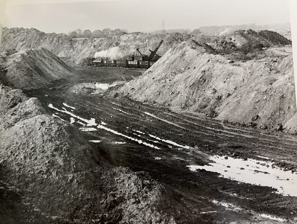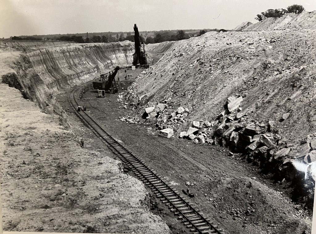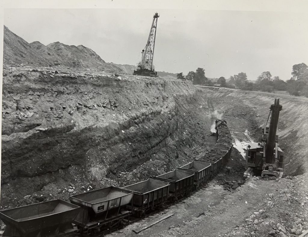 The length of workings is very clear in the above image . The depth of the over burden can also be realised, by using the stripping shovel for scale. 31st July 1956, Northants archives .